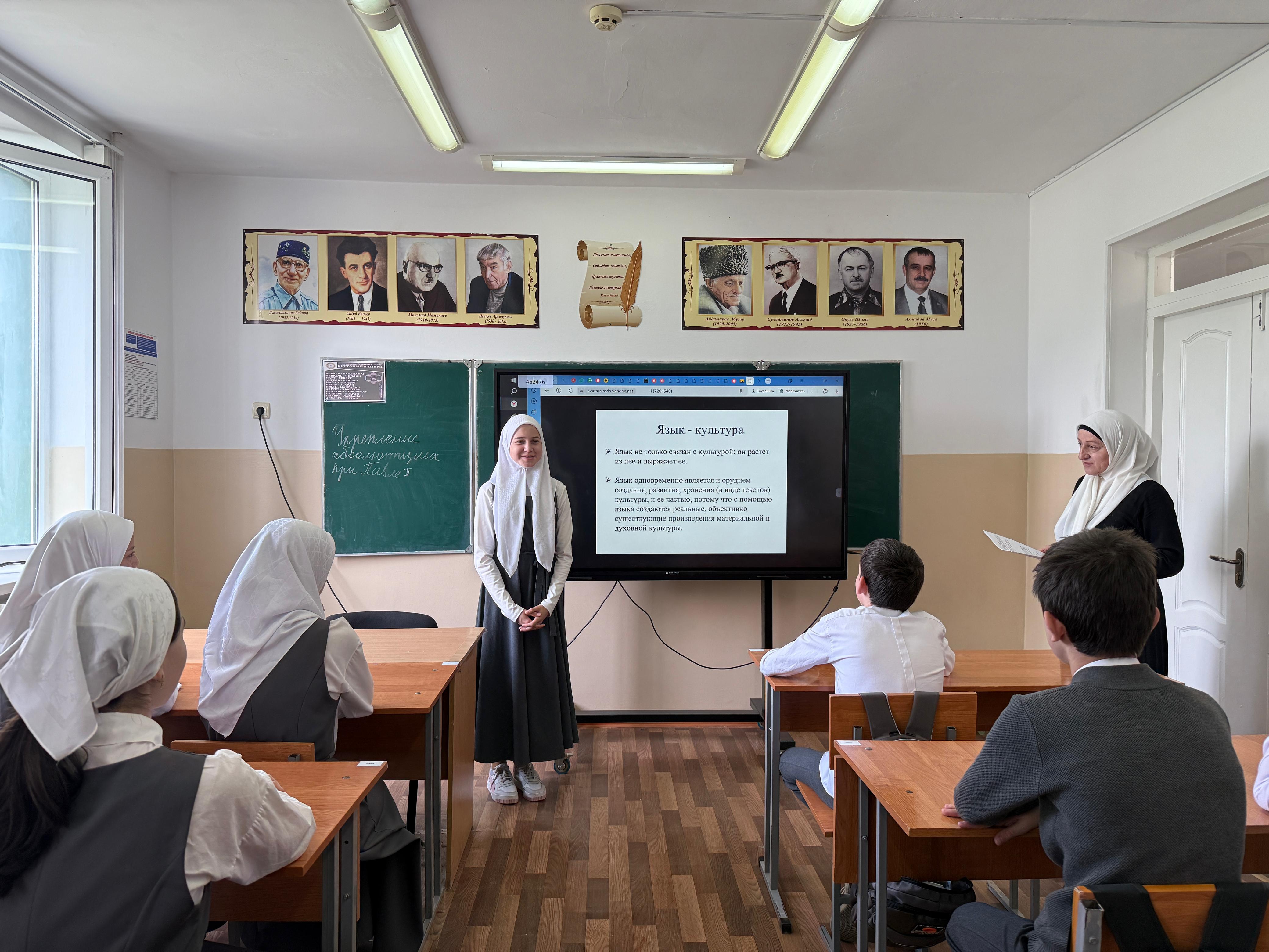 25.04.2025Мероприятие, организованное в рамках Программы комплексного развития молодежной политики на 2025 год, преследовало следующие цели: - раскрыть значение языка как важнейшего инструмента коммуникации и хранителя культурного наследия; - изучить языковое разнообразие и его влияние на традиции народов; - обсудить вызовы, стоящие перед языками в эпоху глобализации и миграции; - способствовать популяризации языкового и культурного наследия. В лекциях приняли участие обучающиеся 8 класса. Язык – главное достояние народа, и его сохранение – священный долг каждого. Огромный вклад в сохранение чеченского языка внёс Глава Чеченской Республики, Герой России Р.А. Кадыров. Его искренняя любовь к родной речи проявляется в словах: «Народ жив, пока жив его язык. Мы должны бережно относиться к родной речи.»